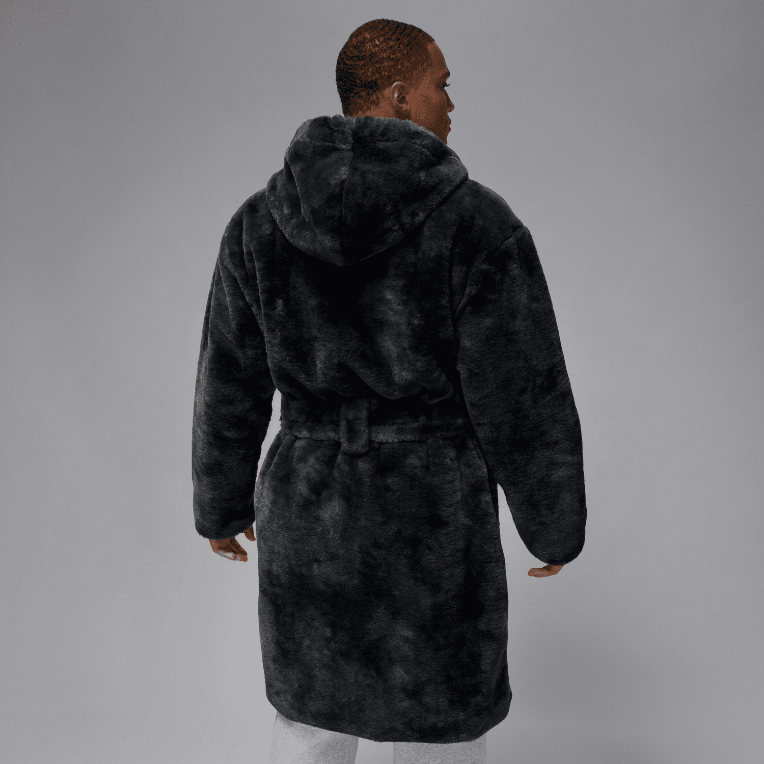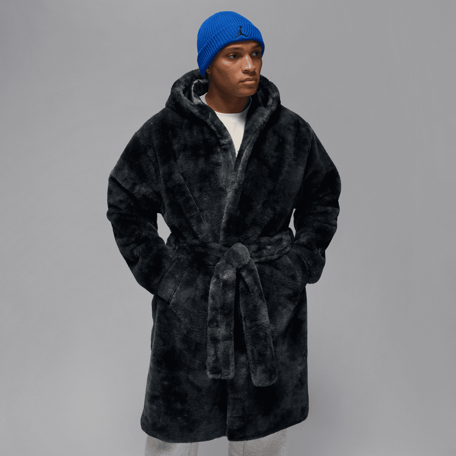 Kick back in premium comfort worthy of His Airness. This plush faux fur robe features a satin-lined hood, pockets and a matching belt for maximum coziness. And, check out that Jordan logo on the sleeve.