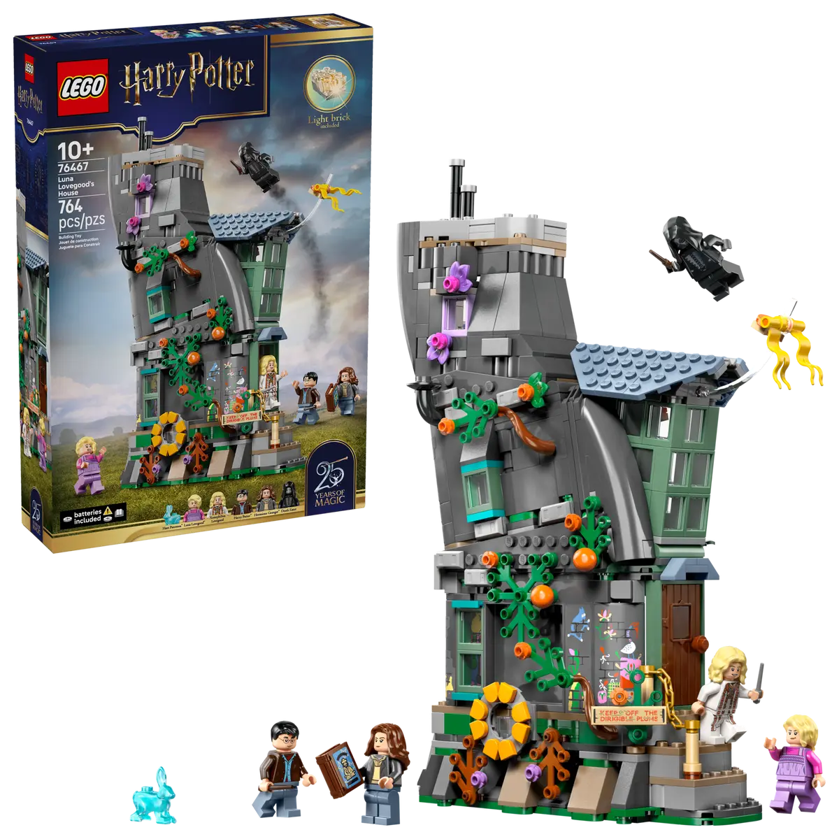Explore the whimsical world of the Lovegoods with the first-ever LEGO® Harry Potter™ model of Luna Lovegood’s unique house (76467). A magical gift for girls, boys and any Harry Potter fans ages 10 years old and up, this building toy lets kids capture the house’s eccentric, charming location and bring the Harry Potter and the Deathly Hallows™ scenes to life with 5 minifigures. Pull out furniture from the kitchen for easy play and activate the LEGO light brick to project images from The Tale of the Three Brothers on the wall. Check out Luna’s bedroom and Xenophilius Lovegood’s printing workshop. And recreate the heroes’ escape scene with the Erumpent horn. The set also includes Luna’s Hare Patronus™, one in a collectible series of LEGO Harry Potter 25th anniversary Patronuses (in sets sold separately). Kids can build with confidence using the LEGO Builder app, which lets them zoom, rotate in 3D and track progress with easy-to-follow digital instructions. Set contains 764 pieces.