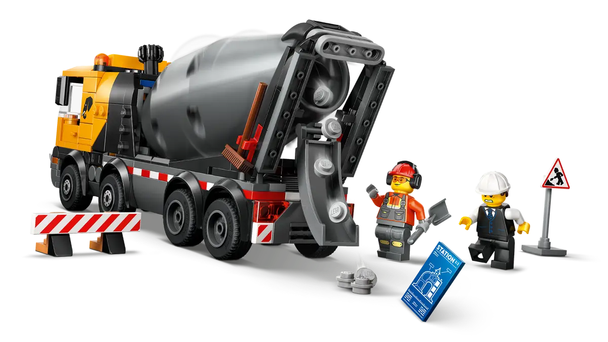 - LEGO® MINIFIGURE ACCESSORIES – This cement truck model comes with LEGO accessories including a wheelbarrow, road sign, 2 barriers, a clipboard, spade and broom