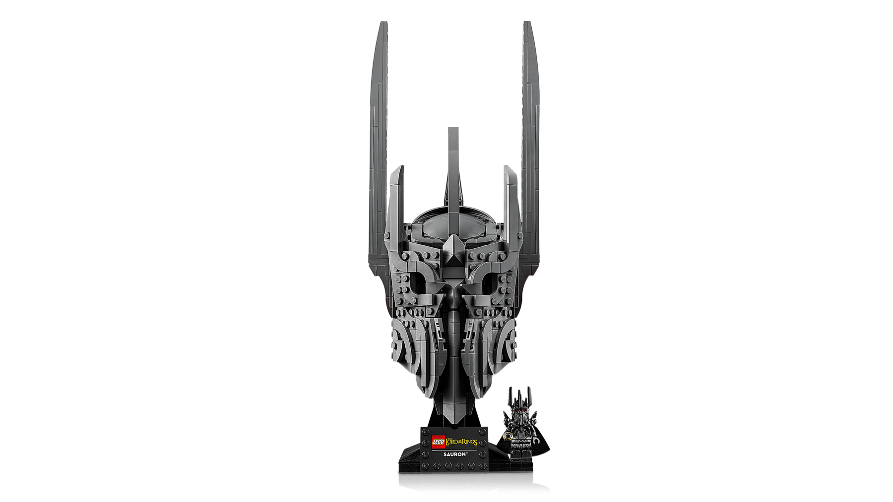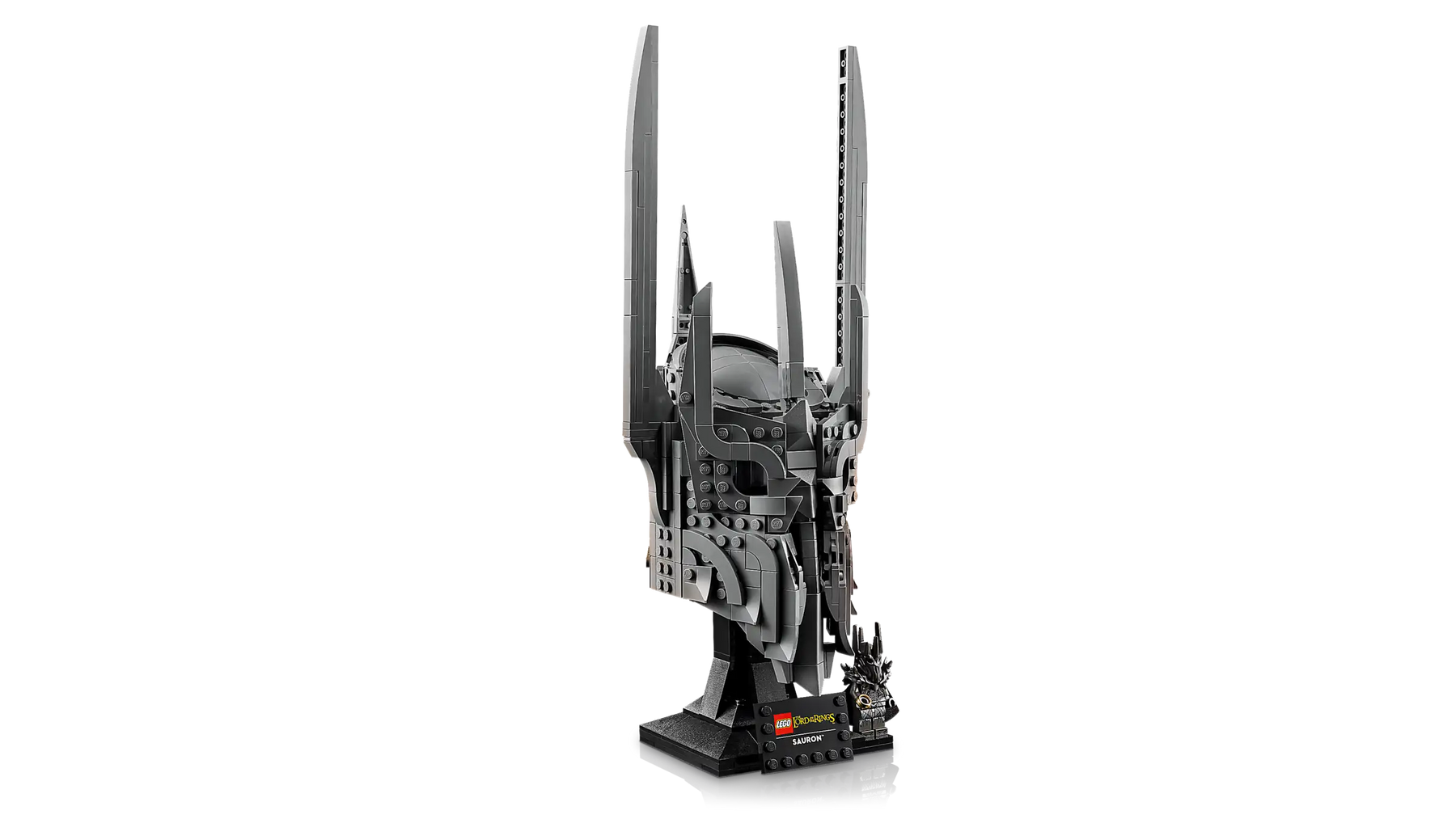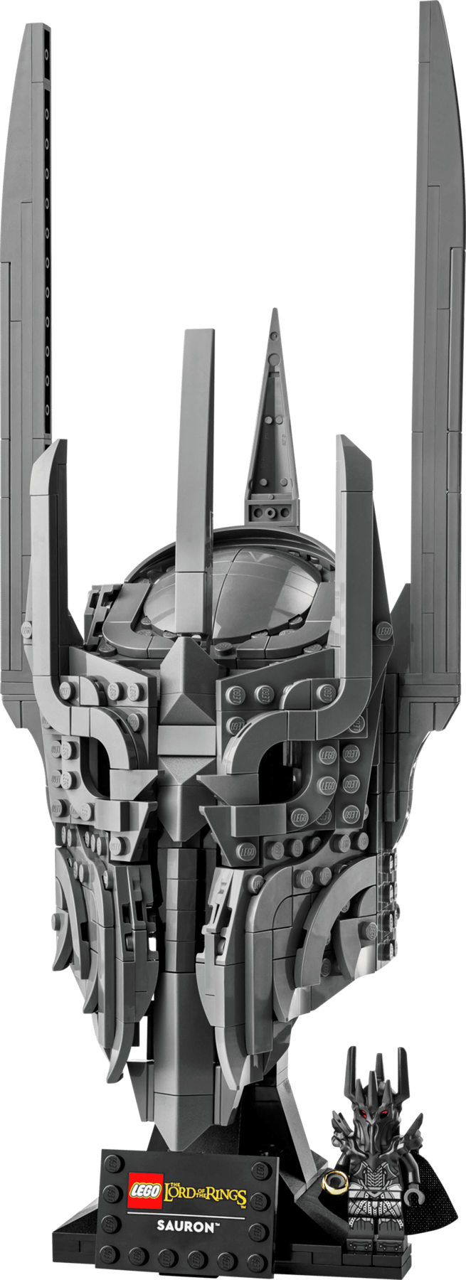- WHAT’S IN THE BOX – Includes everything you need to craft a replica of Sauron’s helmet, plus a display stand and name plaque along with a Sauron™ minifigure holding The One Ring