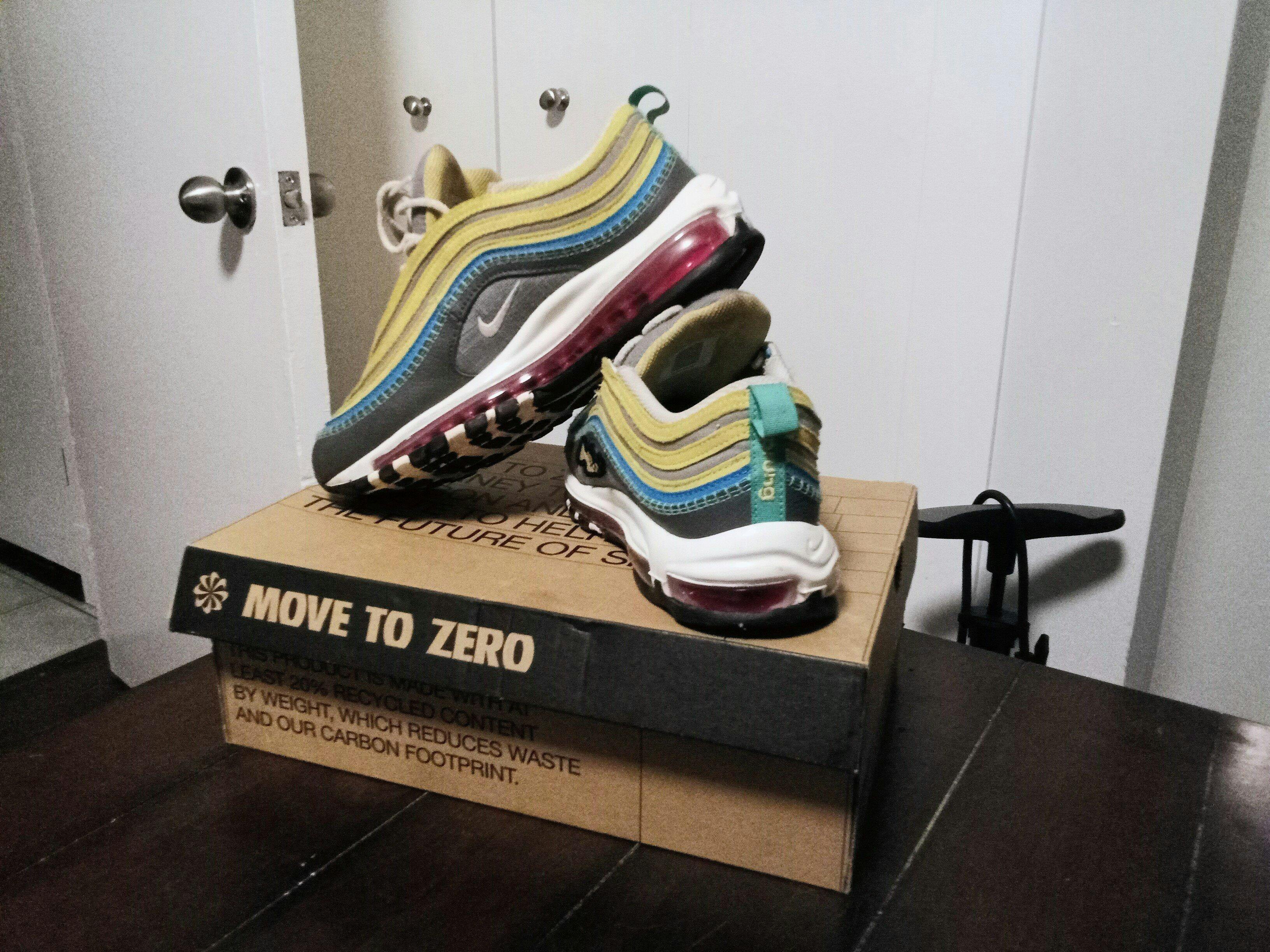Nike Air Max 97 SE Men's Shoes Blooming with springtime details, this edition of the AM97 is all about new beginnings—including some materials that are getting a second life through recycling. Made from at least 20% recycled materials. Classic canvas underlays keep it airy, deco stitching energizes the look and embroidered graphics keep your style fresh as a spring daisy.