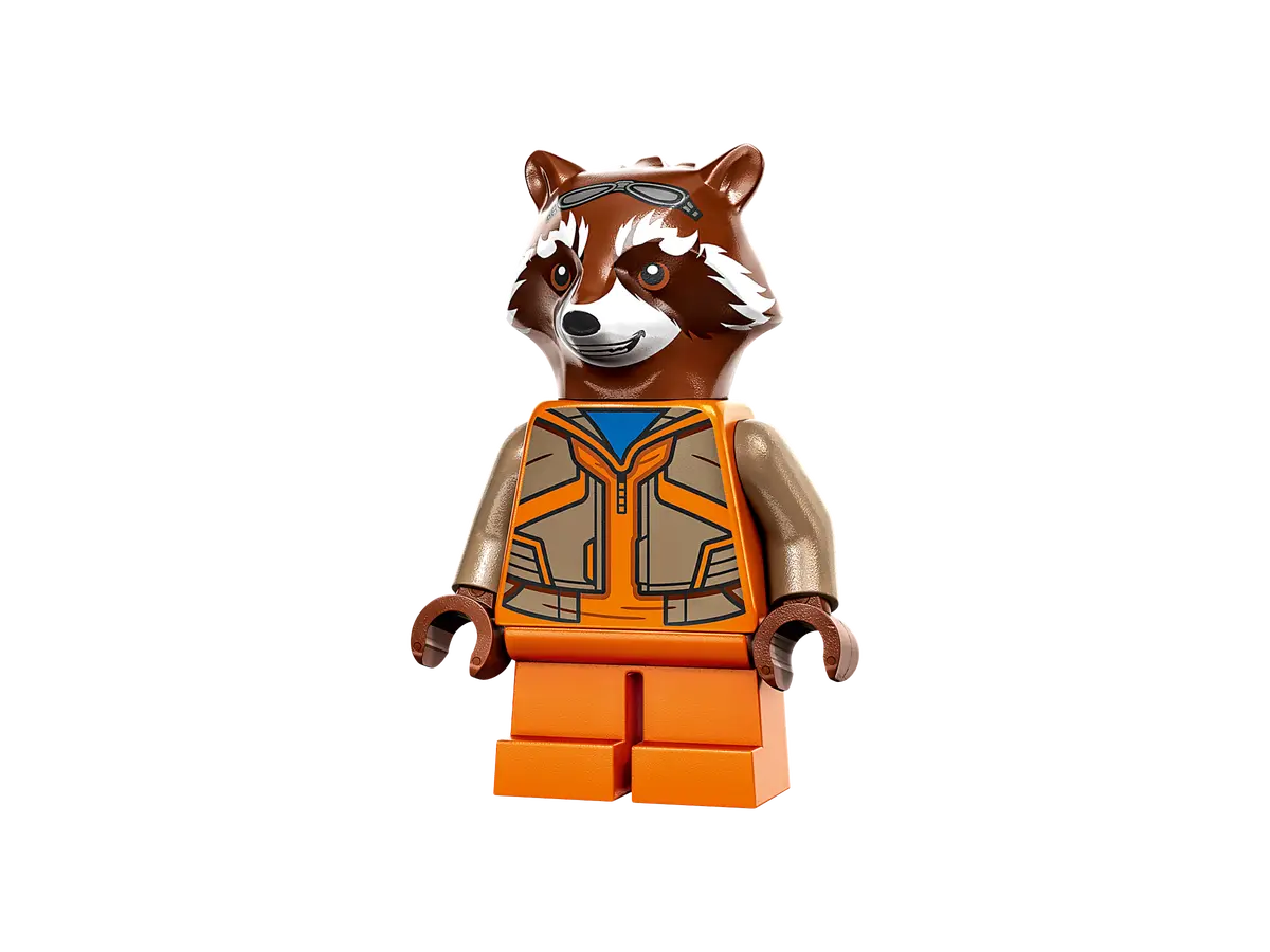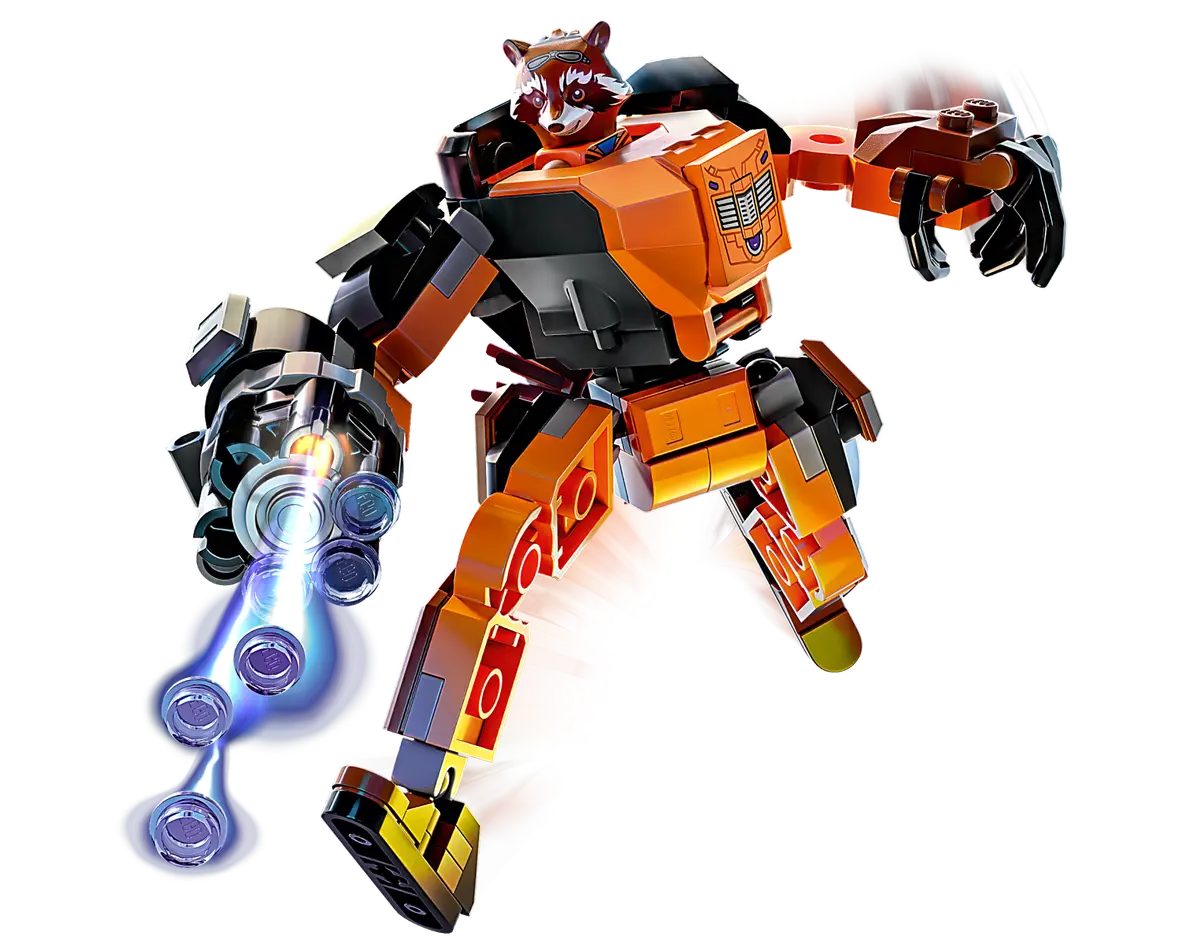 This supersized LEGO® mech figure puts Marvel’s raging raccoon in the cockpit of his own mighty battling machine.
